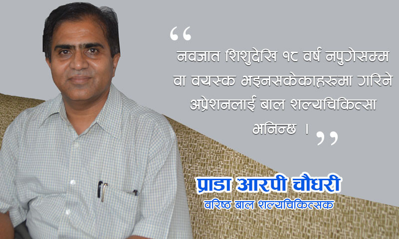 नवजात शिशुदेखि १८ वर्ष नपुगेसम्म वा वयस्क भइनसकेकाहरूमा गरिने अप्रेशनलाई बाल शल्यचिकित्सा भनिन्छ । यो अवस्थामा कस्ता कस्ता अप्रेशन गरिन्छ, अप्रेशन गर्ने कुन उमेर उपयुक्त हो लगायत विषयमा वरिष्ठ बाल शल्यचिकित्सक आरपी चौधरीले आफ्ना कार्य अनुभव हाम्रो डक्टरमार्फत पस्केका छन् । जानौं डा. चौधरीका सुझाव :–
