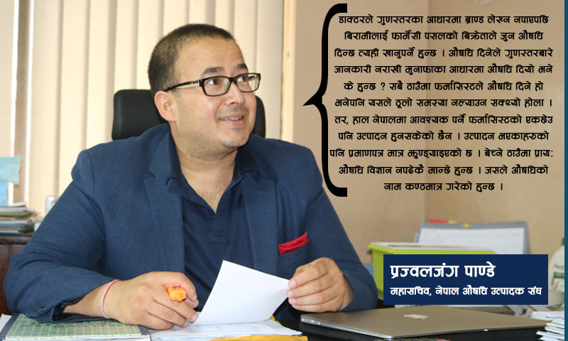 औषधिको गुणस्तरका बारेमा जानकार चिकित्सक हुन् । डाक्टरहरुको पनि आआफ्नै ब्राण्ड हुन्छ । उसले कयौं बिरामी र आफ्नो अनुभवबाट औषधिको प्रभावकारिता र गुणस्तर मापन गरेर ब्राण्डका आधारमा सिफारिस गर्छ । एकाध डाक्टरको कमजोरीलाई सामान्यीकरण गरेर जनस्वास्थ्यमा खेलवाड गर्ने खालको कमजोर निर्णय गर्नुहुँदैन । गुणस्तरीय भएर नै ब्राण्ड बनेको हुन्छ । ब्राण्डलाई अविश्वास गर्नु हुँदैन । बरु, स्वदेशमा उत्पादन हुने औषधिको गुणस्तरलाई कसरी वृद्धि गर्ने भन्नेमा हामी सरकारलाई साथ दिन तयार छौं ।