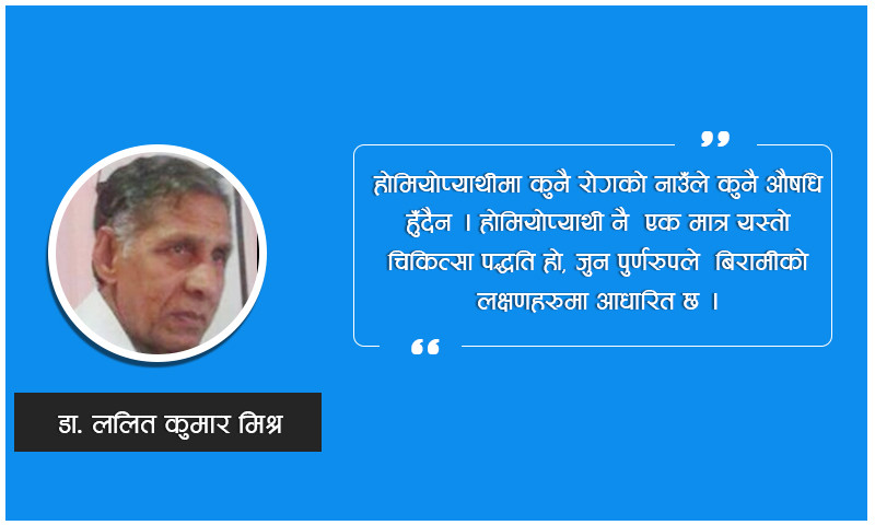 होमियोप्याथीमा कुनै रोगको नाउँले कुनै औषधि हुँदैन । होमियोप्याथी नै एक मात्र यस्तो चिकित्सा पद्धति हो, जुन पुर्णरुपले बिरामीको लक्षणहरुमा आधारित छ । यसैकारण होला यसमा यस्ता बिरामीहरु पनि निको भएका छन् । जसले म निको हुन्छ भने आशा नै मारी सकेका थिए । एउटा कुशल होमियोप्याथिक चिकित्सकले रोग निदानको क्रममा तपाईसँग विभन्न प्रकारका प्रश्नहरु सोध्न सक्छ । तपार्इंले दिएको जानकारी अनुसार नै औषधि चयन गरिन्छ । अतः चिकित्सकले सोधे अनुसार बिरामीले आफ्नो समस्या खुलस्त रुपमा बताउनु पर्छ । बिरामीले भोगिरहेको शारीरिक, मानसिक एवं भावनात्मक अवस्थाहरु पनि खुलेर भन्नु पर्छ । विगतमा भएका रोगको बारेमा पनि बताउनु पर्छ । होमियोप्याथी चिकित्सामा रोगलाई मात्र हैन, रोगीलाई नै पुर्णतया उपचार गर्ने गरिन्छ ।