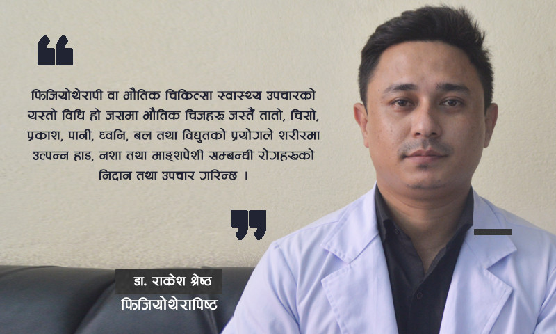 फिजियोथेरापी सबै उमेर समूहका बिरामीका लागि आवश्यकता हुन्छ । चाहे हाडजोर्नी तथा नशा सम्बन्धी होस वा स्त्री रोग, मानसिक रोगबाट ग्रसित हुनै सबै व्यक्तिका लागि फिजियोथेरापी आवश्यक हुने बताउँछन डा. राकेश श्रेष्ठ । नेपालमा फिजियोथेरापी उपचार पद्धति र यसप्रति आममानिसको आर्कषण बारे हाम्रो डक्टरकी प्रतिनिधि ज्ञानु दुलालले डा. श्रेष्ठसँग गरेको कुराकानीको सम्पादित अंश ः—