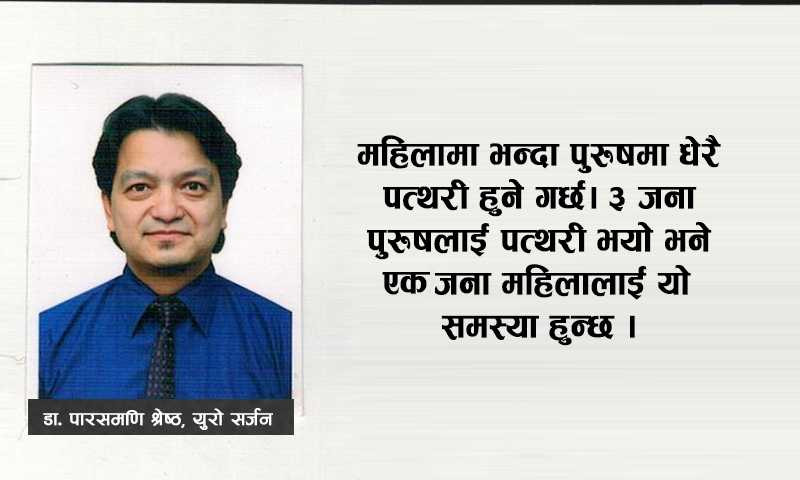 - नेपालमा पुरुषलाई केही भए तुरुन्त उपचार गर्ने चलन छ । तर, महिलामा ढिला उपचार गर्ने चलन छ । जसले गर्दा महिलामा भएको मिर्गाैलाको पत्थरीका कारण मिगौला नै खाराब हुने अवस्था छ । मिर्गाैला बिग्रिएपछि मात्र उपचारमा आउने भएकाले मिर्गाैला नै फ्याल्नु पर्ने भएकाले समयमा नै उपचार गरौ ।