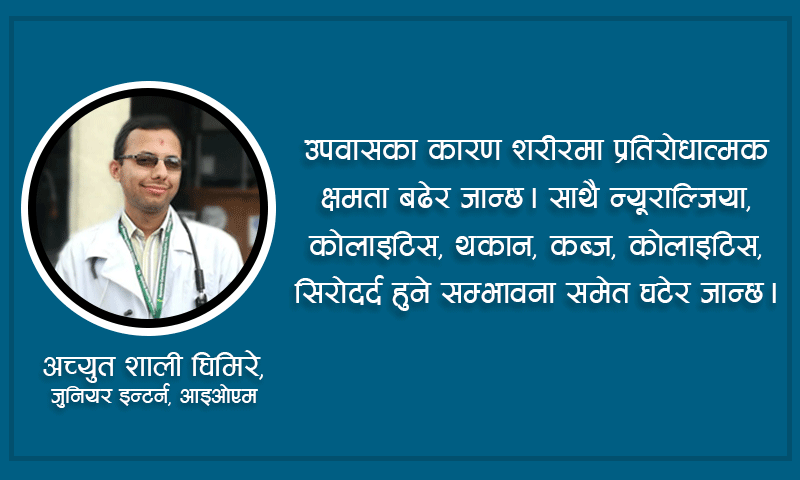 हाम्रो देश नेपालमा विगत लामो समय देखि नै उपवासलाई धेरै नै महत्व दिने गरिएको छ । भगवानका निमित्त आफ्नो मनोकामना पूरा गर्ने हेतुले तथा आध्यात्मिक एवं धार्मिक साधनाका रुपमा प्राचिन समयदेखि नै उपवासको महत्व झल्किदै आएको छ।बिशेष गरि पौराणिक ग्रन्थहरुलाई आधार मानेर हिन्दु नारी जातिहरुको महान् पर्व तीजमा शिव जस्तै योग्य श्रीमान् पाउने अभिलाषा साचेर उपवास बस्ने प्रचलन छ। तर उपवास श्रद्धा र भक्तिभावका लागि मात्र नभएर साच्चिकै स्वास्थ्यका लागि समेत लाभदायक रहन्छ भन्दा धेरैलाई अचम्म लाग्न सक्छ।