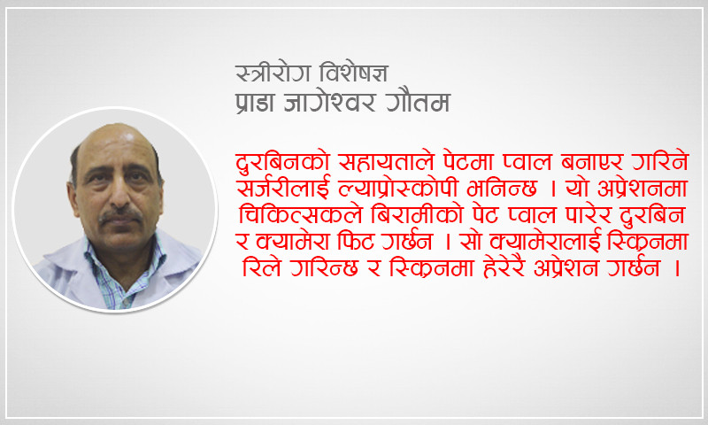दुरबिनको सहायताले पेटमा प्वाल बनाएर गरिने सर्जरीलाई ल्याप्रोस्कोपी भनिन्छ । यो अप्रेशनमा चिकित्सकले बिरामीको पेट प्वाल पारेर दुरबिन र क्यामेरा फिट गर्छन । सो क्यामेरालाई स्क्रिनमा रिले गरिन्छ र स्क्रिनमा हेरेरै अप्रेशन गर्छन । यस्तो बेला पेटमा ५ देखि १० मिलिमिटरको प्वाल पारिने स्त्री रोग विशेषज्ञ डा. जागेश्वर गौतमको भनाइ छ । यो अप्रेशन प्रविधिका फाइदा र बेफाइदा बारे डा. गौतमको केही सुझाव यस्तो छ ।