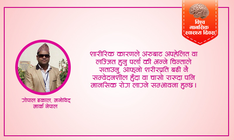 ललितपुर बस्ने २० वर्षीय कृष्ण श्रेष्ठ (नाम परिवर्तन) प्रायः जसो घरमा मात्रै बसी रहन्छन् । बाहिर काही जानुप¥यो भने रात परेपछि मात्रै निस्कन्छन् । उनले पढाइ पनि बिचैमा छोडे । उनलाई पनि एउटै कुराले सताउने गर्छ । ‘मेरो अनुहार राम्रो छैन । अनुहार भरी डन्डीफोर र दागैदाग छ । अरुले केही भन्छन कि भनेर लाज लाग्छ ।’ तर, उनले भने जस्तो उनको अनुहारमा त्यस्तो नराम्रो केही पनि खराबी छैन ।