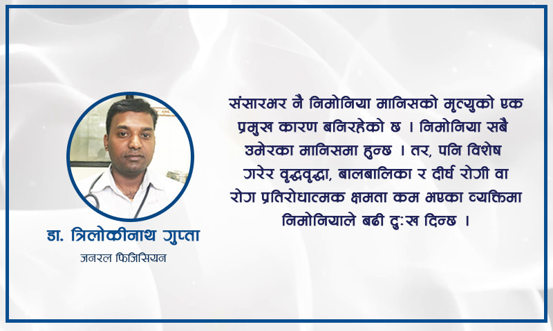 चिसो मौसम सुरु भएको छ । चिसो बढेसँगै वृद्धवृद्धामा निमोनिया संक्रमण बढी हुन्छ । थोरै असावधानी गर्दा निमोनियाले वृद्धवृद्धाको ज्यानै लिने गरेको छ । के हो निमोनिया ? र यसबाट वृद्धवृद्धालाई कसरी जोगाउने भन्ने विषयमा जनरल फिजिसियन डा. त्रिलोकीनाथ गुप्ताको सुझाव यस्तो छ ः—