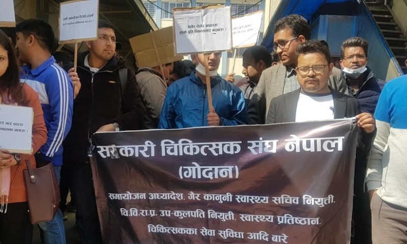 माग पूरा गराउन सरकारी चिकित्सक संघ (गोदान) ले देशभरका १४ सय सरकारी चिकित्सकलाई पूर्वनिर्धारित अप्रेसन, विशेष परीक्षण र स्वस्थ्य सेवा बहिष्कार गर्न भन्दै आन्दोलनमा उतारेको हो । ‘हामी समायोजनमा जान्छौं, तर सबै चिकित्सकलाई संघीय सरकारअन्तर्गत राखेर प्रदेश र स्थानीय तहमा परिचालन गर्नुपर्छ,’ सरकारी चिकित्सक संघ (गोदान) का अध्यक्ष डा. दीपेन्द्र पाण्डेले भने, ‘कुनै चिकित्सकलाई सधैँ एउटै गाउँपालिकामा मात्र सीमित गराएर राख्ने हो भने अध्ययनलगायत उसको वृत्ति विकास कसरी हुन सक्छ ?’