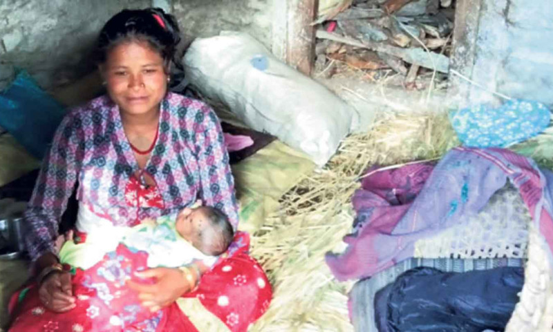 बाजुरा, १ जेठ । स्वामीकार्तिक खापर गाउँपालिका–५ की धर्मा बुढा सुत्केरी भएको एक महिना भइसक्यो । तर, अझैसम्म उनी गोठमै बस्दै आएकी छिन् । सुत्केरीलाई एक महिनासम्म घरभित्र राख्नु हुँदैन भन्ने मान्यताले परिवारले उनलाई गोठमै राखेको हो । दिउँसै अँध्यारो गोठ निहुरिएर भित्र पस्नुपर्ने अवस्थाको छ । गोठमा झ्याल छैन, सानो दुलोजस्तो ढोका छ ।