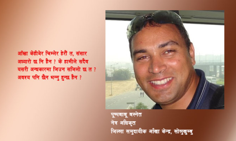 आँखा हाम्रो शरीरको अति संवेदनशिल अंग हो भन्ने सबैलाई थाहा छ । हुन पनि आँखा केहीबेर चिम्लेर हेरौं त, संसार अध्यारो हुन्छ ? के हामी सदैव यसरी अन्धकारमा जिउन सहजै सक्छौं त ? अवश्य पनि गाह्रो छ ।