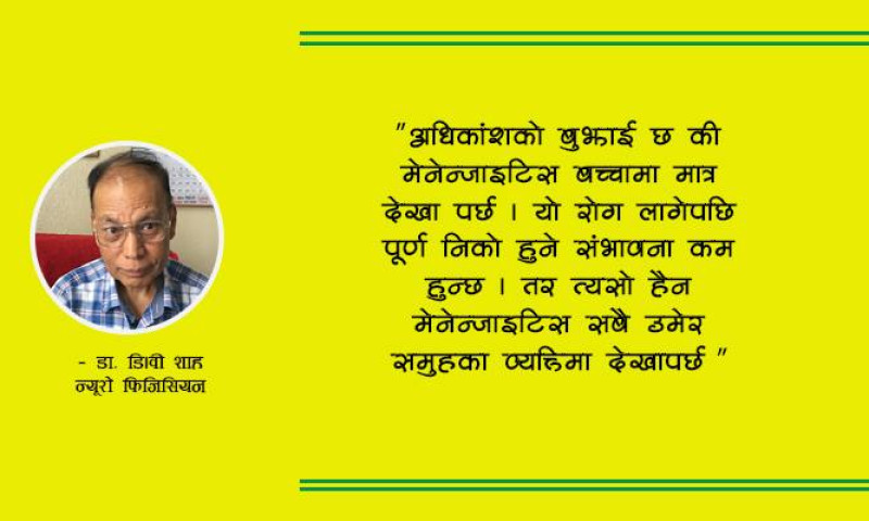 अधिकांशको बुझाई छ की मेनेन्जाइटिस बच्चामा मात्र देखा पर्छ । यो रोग लागेपछि पूर्ण निको हुने सम्भावना कम हुन्छ । तर, त्यसो हैन मेनेन्जाइटिस सबै उमेर समूहका व्यक्तिमा देखापर्छ । के हो मेनेन्जाईटिस ? यो हुने कारण ? यसका लक्षण र बच्ने उपाय बारे न्यूरो फिजिसियन डा. डिबी शाह यसो भनछन् :-