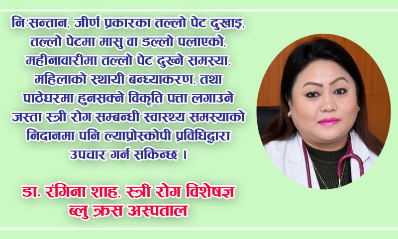 पेटमा स–साना घाउ बनाइ फाइबर अप्टिक इन्डोस्कोप (दूरबिन) को मद्दतले तल्लो पेटका भित्री अङ्गहरूको समस्या हेर्ने विधिलाइ ल्याप्रोस्कोपी भनिन्छ । यस विषयमा स्त्री तथा प्रसुति रोग विशेषज्ञ डा. रंगिना शाह संग गरिएको कुराकानी ।