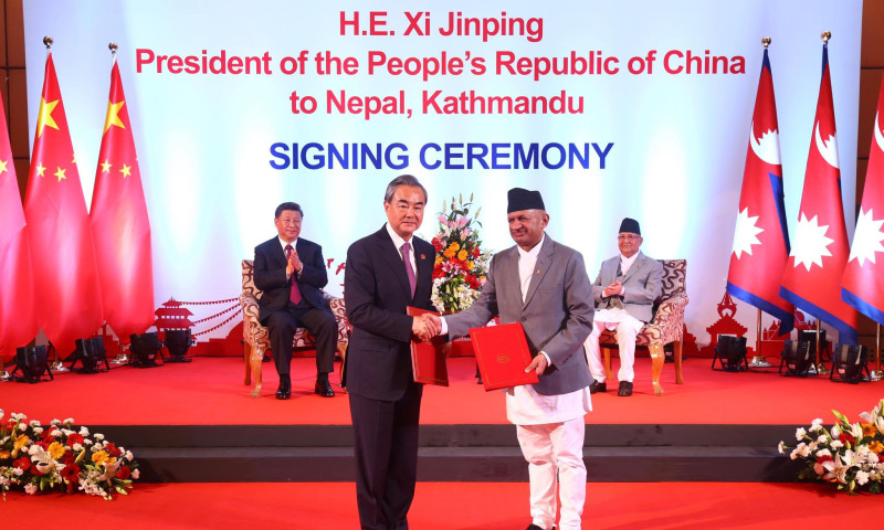 काडमाडौं, २६ असोज । दुई दिवसीय नेपाल भ्रमणमा रहेका चिनियाँ राष्ट्रपति सी जिनपिङ र नेपालका प्रधानमन्त्री केपी शर्मा ओलीको उपस्थितिमा डेढ दर्जन विषयमा सहमति र सम्झौता आदानप्रदान भएको छ ।