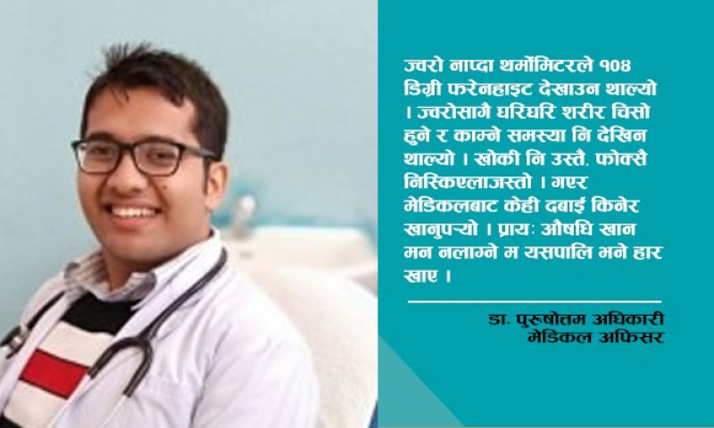 दिन बित्दै गयो । सामान्य रुघाबाट सुरु भएको बिमार खोकी, घाँटी दुख्ने हुँदाहुँदै छाती दुख्ने र ज्वरो आउनेसम्म पुग्यो । त्यसपछि आलस्य हुने, जिउ दुख्ने र टाउको दुख्ने समस्या पनि थपिए । हेर्दाहेर्दै फूलपाती पनि आयो । बिमारी झन्झन् बढ्दै गयो ।