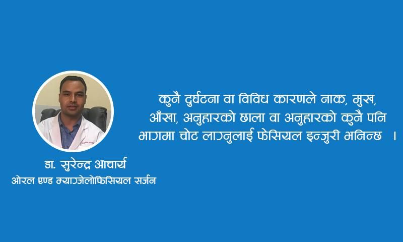 के हो फेसियल इन्जुरी ? फेसियल इन्जुरीको उपचार किन आवश्यक छ ? फेसियल इन्जुरीको उपचारपछि अनुहारलाई कसरी स्वस्थ र सुन्दर राख्ने भन्ने विषयमा ओरल एण्ड म्याग्जेलोफिसियल सर्जन डा. सुरेन्द्र आचार्यसँग गरिएको कुराकानीको सम्पादित अंश :—