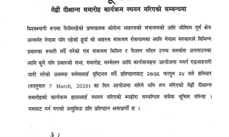 Issuing a notice today the institution has said that an advisory has been released by the World Health Organisation to not conduct any kinds of events and gatherings that increase the crowd and as Nepal too is in a risk zone the health institution has postponed the event until further notice.