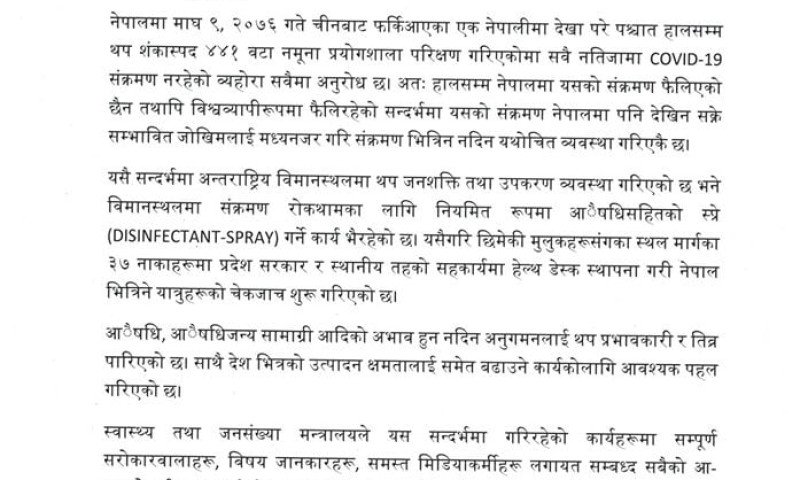 The ministry also said that an additional manpower and equipments have been used in the Tribhuvan International Airport and disinfectant has been sprayed regularly in the airport to prevent infection spread.