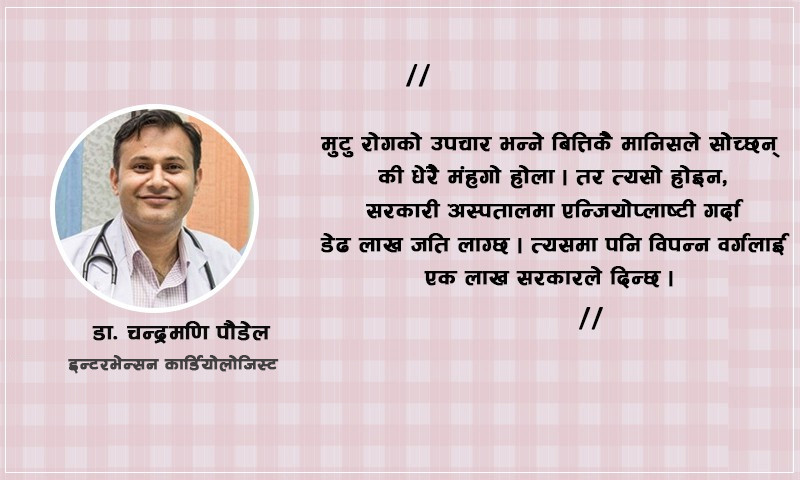 मुटु रोगको उपचार भन्ने बित्तिकै मानिसले सोच्छन् की धेरै महँगो होला । तर त्यसो होइन, सरकारी अस्पतालमा एन्जियोप्लाष्टी गर्दा डेढ लाख जति लाग्छ । त्यसमा पनि विपन्न वर्गलाई एक लाख सरकारले दिन्छ ।
