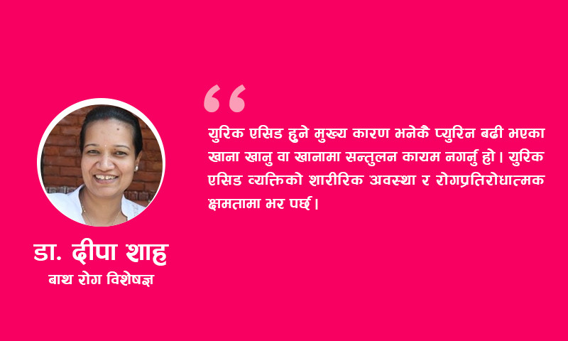 धेरै नेपालीमा युरिक एसिडको समस्या छ । युरिक एसिडको बेलैमा उपचार नगरे यसबाट बाथ हुन्छ भन्ने जानकारी भने निकै कमैलाई मात्रै छ । युरिक एसिड त हो नी... भनेर लापरवाही गर्दा धेरै मानिस गम्भीर प्रकारको बाथ रोगी बनिरहेको बाथ रोग विशेषज्ञ डा. दीपा शाहको भनाइ छ । के हो युरिक एसीडबाट हुने बाथ ? यो हुने कारण, यसका लक्षण र बच्ने उपायबारे डा. शाहले दिएको सुझाब यस्तो छ ।