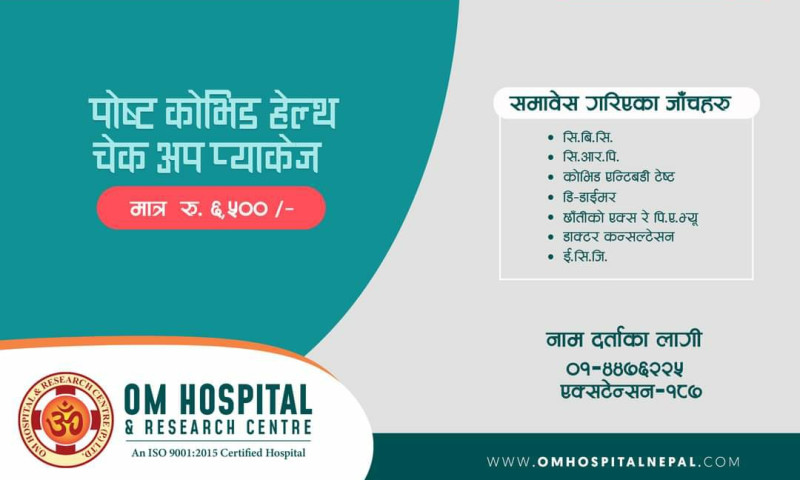 कोभिड संक्रमणमुक्त भइसकेको अवस्थामा र त्यसपछि देखा पर्ने विविध स्वास्थ्य समस्याका कारण उत्पन्न हुनसक्ने जटिल अवस्थाहरुबाट जोगाउन ॐ हस्पिटलले आवश्यक जाँच तथा परीक्षणसहितको सुलभ ‘पोष्ट कोभिड हेल्थ चेकअप’ को घोषणा गरेको हो ।