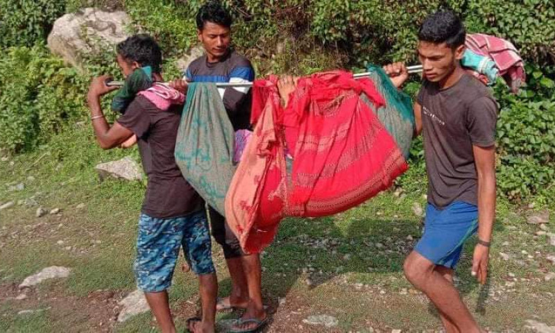 सुत्केरी व्यथा लागेकी महिलाले स्ट्रेचर नपाउँदा झोलुङ्गोमा बोकेर स्वास्थ्यचौकी पुर्याइयो
