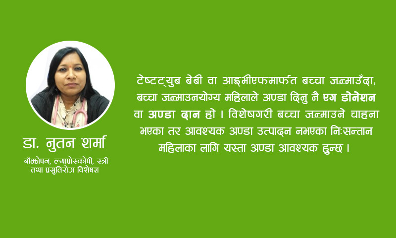 पुरुषबाट दान गरिएको विर्यबाट बच्चा जन्माउने पद्धति त नेपालमा धेरै पहिलेदेखि अभ्यास हुँदै आएको छ । तर, अब महिलाले दान गरेको अण्डा वा एग डोनेशनबाट बच्चा जन्माउने क्रम पनि बढिरहेको छ । के हो एग डोनेशन ? यो कसरी गरिन्छ ? एग डोनेशन गर्ने र लिने महिलामा केही असर पर्छ वा पर्दैन ? भन्ने विषयमा बाँझोपन, ल्याप्रोस्कोपी, स्त्री तथा प्रसुतिरोग विशेषज्ञ डा. नुतन शर्माको भनाइ यस्तो छ :