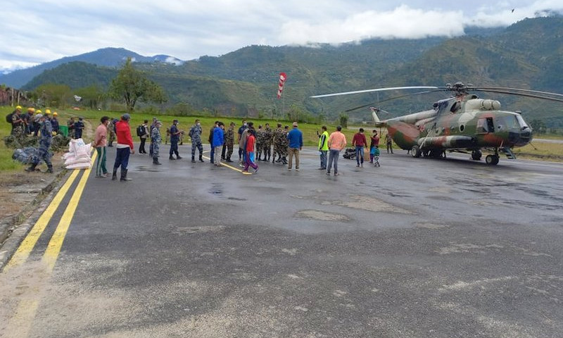बेपत्ता भएकाहरूको खोजी तथा उद्धारका लागि राहत सामग्री र औषधि लिएर हेलिकोप्टर घटनास्थल थलारा पुगेको डिएसपी रुपक खड्काले बताए।