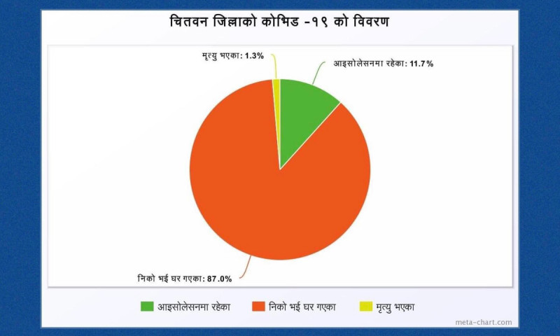कार्यालयका अनुसार अहिलेसम्म जिल्लाभर संक्रमित मध्ये ८७ प्रतिशत निको भईसकेका छन् । त्यस्तै, संक्रमित मध्ये ११ दशमलव ७ प्रतिशत आईसोलेसनमा छन् भने १ दशमलव ३ प्रतिशतको मृत्यु भएको छ ।