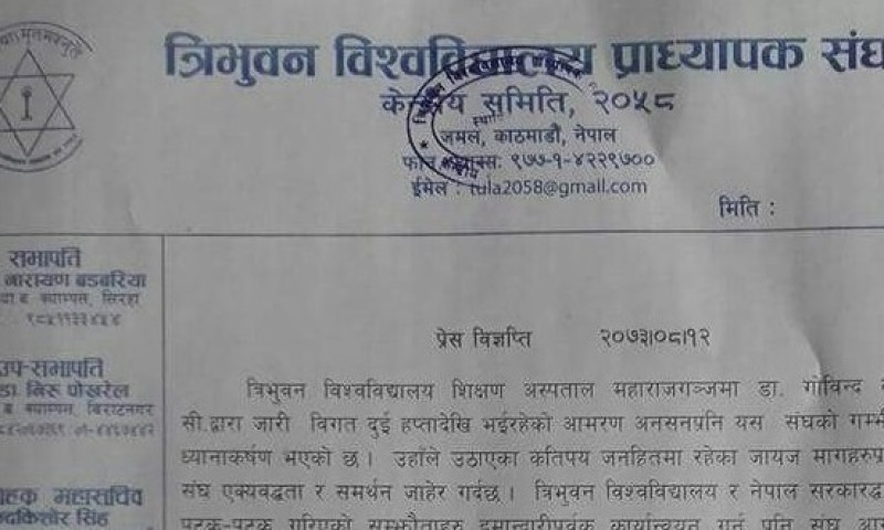 काठमाण्डौ, १२ मंसिर । त्रिभुवन विश्वविद्यालय प्राध्यापक संघले डा. गोविन्द केसीका केही मागहरुको विरोध गरेको छ ।