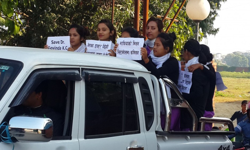 स्वास्थ्य र शिक्षा मन्त्री मेडिकल माफियाको पक्षपोषणमा लागिपर्दा डा. गोविन्द केसीको माग सम्वोधन गर्न नसकेको भन्दै चितवनको भरतपुर चिकित्सक र औषधि व्यवसायीहरुले प्रदर्शन गरेका छन् । भरतपुरबाट निकालिएको ¥यालीमा डाक्टर, नर्स, सर्वसाधारण, औषधि व्यवसायी, एम आर, नर्सिङका विद्यार्थीलगायतका व्यक्तिहरु साइकल, मोटरसाइलक, कार लिएर ¥यालीमा सहभागी भएका थिए । भरतपुरको गेष्ट हाउस चौरबाट सुरु भएको ¥याली चौबिसकोठी, लायन्सचोक, शहीदचोक हुँदै पुलचोक पुगेर पुनः शहीदचोक, लायन्सचोक, चौबिसकोठी हुँदै पूरानो मेडिकल कलेज परिक्रमा गरेर भरतपुर अस्पतालमा पुगेर सभामा परिणत भएको थियो ।