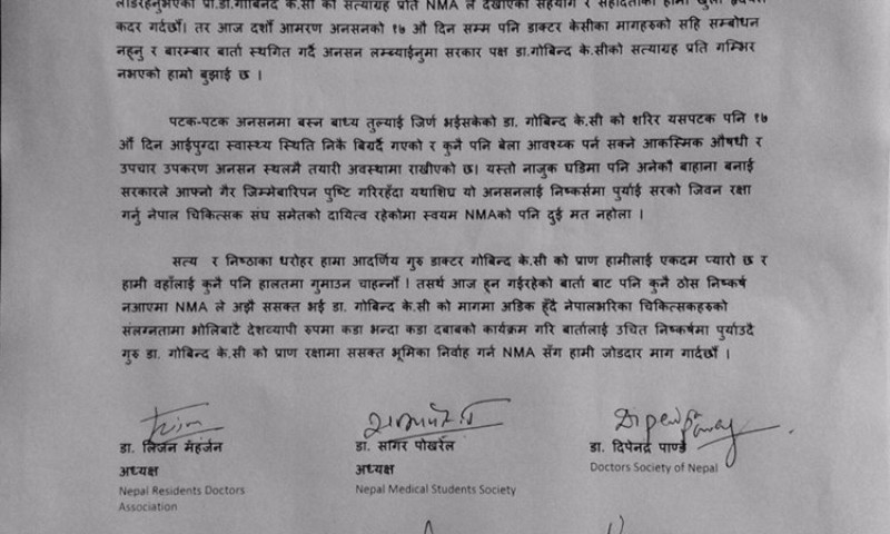 सरकार अनेक बाहाना गर्दै पन्छिरहँदा डा. केसीको स्वास्थ्य अवस्था चिन्ताजनक बन्दै गएको र उनको जीवन रक्षासँगै डा. केसीको माग पुरा गराउन ससक्त आन्दोलन गर्नुपर्ने आवश्यक रहेका निष्कर्ष निकालेका हुन् ।