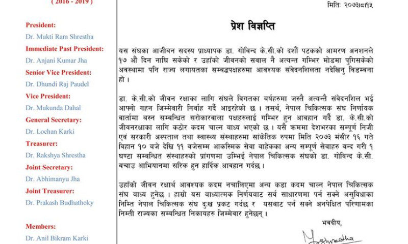 आज विज्ञप्ती जारी गर्दै संघले चिकित्सकहरुलाई एक घण्टा सेवा छाडी अस्पताल प्रांगणमा उभिएर डा केसीको जीवन बचाउ अभियानमा लाग्न आहवान गरेको हो ।