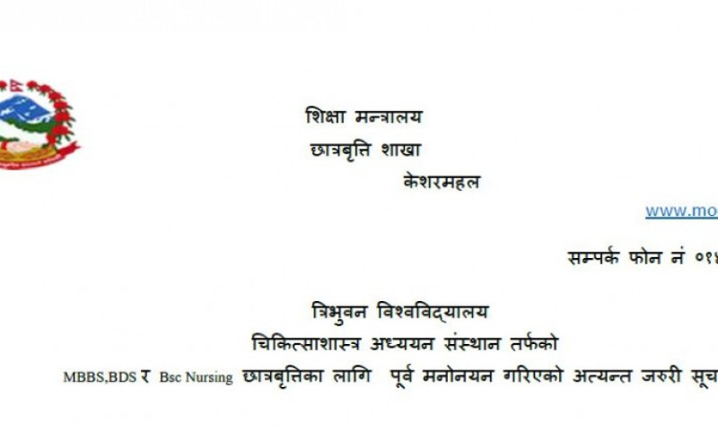 शिक्षा मन्त्रालयले निकाल्यो एमबीबीएस, बीडीएस र नर्सिंङ्गको छात्रवृत्तिको मनोनयन सूचि
