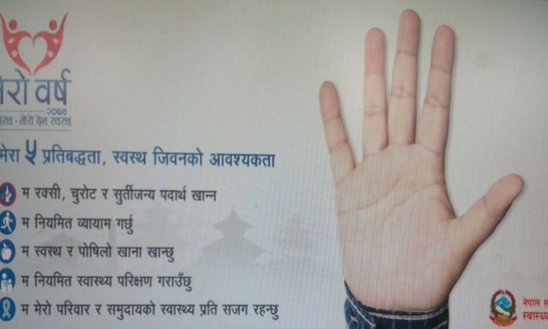 जिल्ला स्वास्थ्य कार्यालय रोल्पाको आयोजनामा रोल्पाको लिबाङमा ‘मेरो वर्ष २०७४, म स्वस्थ, मेरो देश स्वस्थ’ अभियान शुभारम्भ कार्यक्रमका सहभागीले दायाँ हात छातीमा तथा बायाँ हात शिरमाथि राखेर ‘म रक्सी, चुरोट र सुर्तीजन्य पदार्थ खान्न, म नियमित व्यायाम गर्छु, म स्वस्थ र पोषिलो खाना खान्छु । म नियमित स्वास्थ्य परीक्षण गराउँछु तथा म मेरो परिवार र समुदायको स्वास्थ्यप्रति सजग रहन्छु’ भनेर प्रतिबद्धता व्यक्त गरेका हुन् । प्रजिअ डा डिजन भट्टराईले एकै साथ सबैलाई प्रतिबद्धता व्यक्त गर्न लगाएका थिए ।