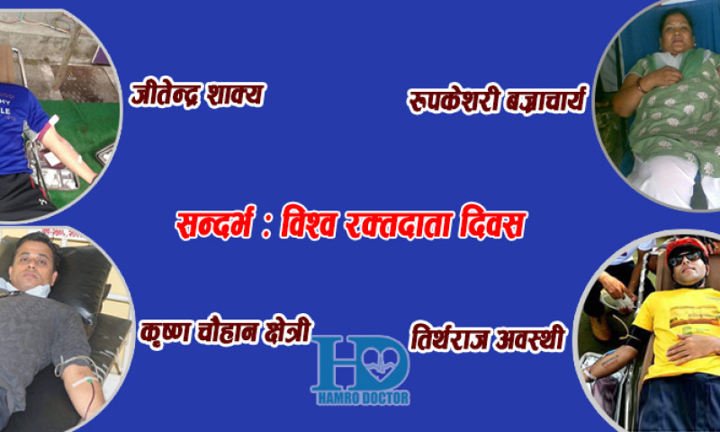 जीवन दानका रुपमा हेरिने रक्तदान गर्नेहरु पछिल्लो समयमा नेपालमा पनि बढ्दै गएका छन् । यसैबीच केही समय अगाडी १५० औं पटक रक्तदान गरेर स्यंवसेवी रक्तदाता समाज नेपालका केन्द्रिय अध्यक्ष प्रेमसागर कर्माचार्य संभवतः नेपालकै धेरै रक्तदान गर्ने व्यक्तिका रुपमा चिनिएका छन् । नेपालमा एक सयको हाराहारीमा रक्तदान गर्नेको संख्या उल्लेख्य रहेको बताइन्छ । आज हामीले ५० औं पटक भन्दा बढी रक्तदान गरेका केही उदाहरणीय व्यक्तित्वको छोटो अनुभव प्रस्तुत गरेका छौं ।