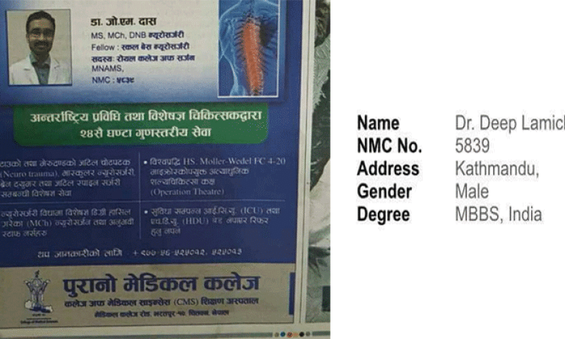 नेपाल मेडिकल काउन्सिलका रजिष्टार डा. दिलिप शर्माका अनुसार एनएमसी नम्बर ५८३९ नेपाली चिकित्सक डा. दिप लामिछानेको हो । उनी पाटन अस्पतालमा कार्यरत छन् । तर, डा. लामिछानेको नम्बरमा नै कलेज अफ मेडिकल साइन्सेस शिक्षण अस्पताल चितवनले डा. दासको नम्बर उल्लेख गर्दै विज्ञापन गरेका छ ।
