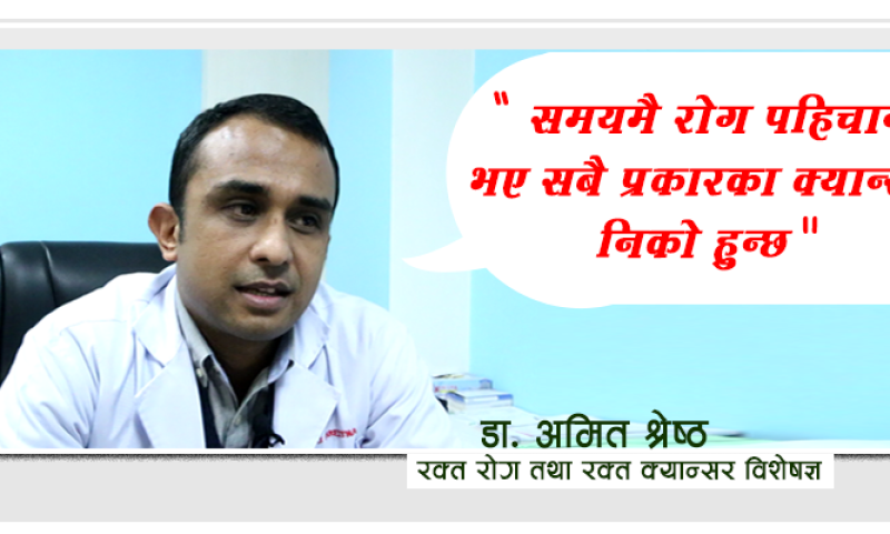 क्यान्सर जटिल प्रकृतिको रोग हो । त्यसमा पनि रक्त क्यान्सरलाई अझ भयावह रुपमा लिइन्छ । नेपाली समाजमा रक्त क्यान्सर भयो भने यसको उपचार नै हुँदैन र बिरामीको तुरुन्त मृत्यु हुन्छ भन्ने सोच । तर समयमै रोग पहिचान भए सबै प्रकारका क्यान्सर निको हुने बताउँछन रक्त रोग तथा रक्त क्यान्सर विशेषज्ञ डा. अमित श्रेष्ठ । रक्त क्यान्सरबाट बच्ने उपायका बारेमा डा. श्रेष्ठको भनाई यस्तो छ :—