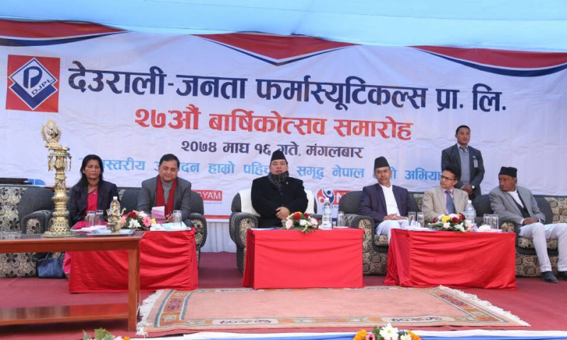 काठमाडौं, १६ माघ । देउराली–जनता फर्मास्यूटिकल्स प्रा.लि.ले मंगलबार २७औं वार्षिकोत्सव मनाएको छ । बार्षिकोत्सव समारोहको उद्घाटन उपराष्ट्रपति नन्दबहादुर पुनले गरेका छन् ।