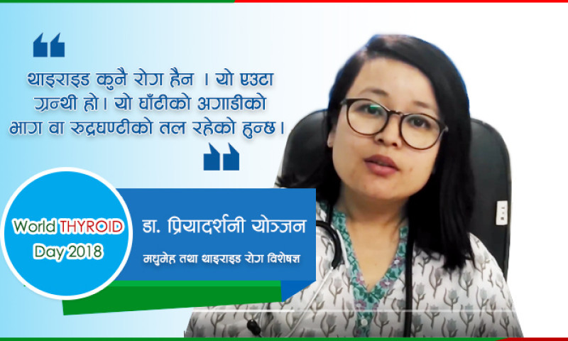 थाइराइडका बारेमा हाम्रो समाजमा धेरै भ्रम रहँदै आएको छ । थाइराइड एक प्रकारको ठुलो रोग हो । यो लागेपछि कम मात्र खानु पर्छ । यो लागेपछि निको हुदैन्, भन्ने धेरै भ्रामक बुझाई छ । के हो थाइराइड ? यसका कस्ता लक्षण हुन्छन् ? र यसबाट कसरी जोगिने ? मधुमेह तथा थाइराइड रोग विशेषज्ञ डा.प्रियादर्शनी योञ्जनसँग गरिएको कुराकानीको सम्पादित अंश: