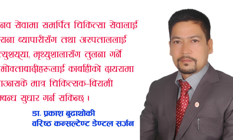 – डाक्टर भनेका सत प्रतिशत जिन्दगी बचाउने अचुक व्यक्ति होइनन् । यी त बिरामीको मृत्यु नहोस् भनेर प्रयास गर्ने र मृत्यृलाई सहज बनाईदिने व्यक्ति मात्र हुन् भनेर बिरामीले बुझुन प¥यो ।
