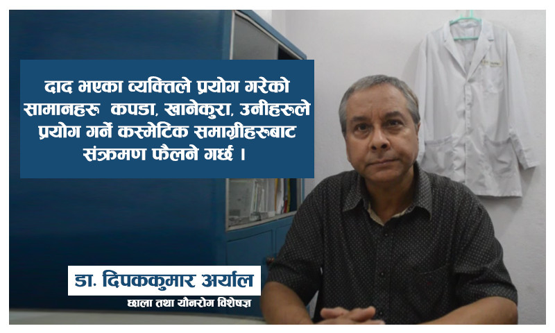 दाद भएका व्यक्तिले प्रयोग गरेको सामानहरु कपडा, खानेकुरा, उनीहरुले प्रयोग गर्ने कस्मेटिक समाग्रीहरुबाट संक्रमण फैलने गर्छ । साथै सरसफाई, खानपीनमा ध्यान नदिनाले पनि दादको संक्रमण छिटोछिटो फैलन्छ । यस्तो समस्याबाट जोगिन र कसरी उपचार गर्ने भन्ने विषयमा छाला तथा यौनरोग विशेषज्ञ डा. दीपककुमार अर्यालले केहिँ सुझाब दिएका छन् ।
