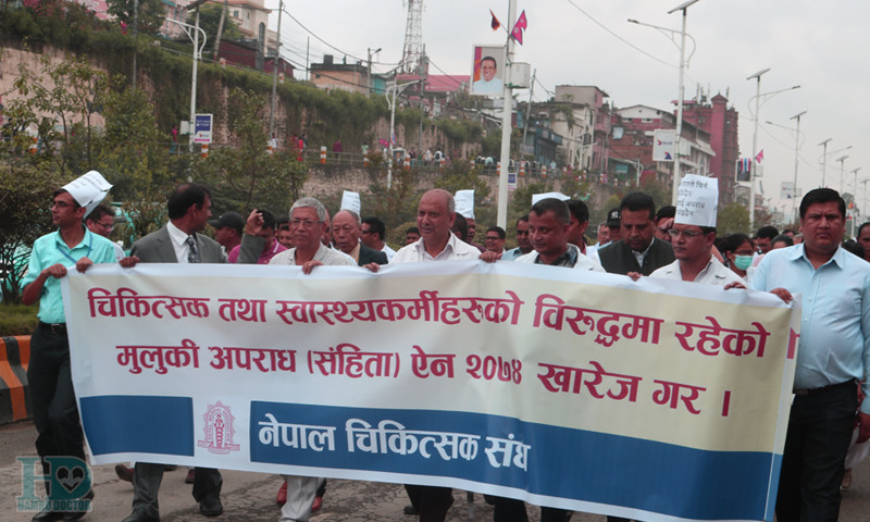 मुलुकी अपराध (संहिता)मा चिकित्सक तथा स्वास्थ्यकमीहरुसँग सम्बन्धित व्यवस्थालाई संशोधन गर्नुपर्ने माग गर्दै नेपाल चिकित्सक संघको अगुवाईमा प्रदर्शन गरिएको हो । प्रदर्शनमा ठूलो संख्यामा चिकित्सक तथा स्वास्थ्यकर्मी सहभागी भएका थिए । सयौंको संख्यामा प्लेकार्ड बोकेका चिकित्सकहरुले मुलुकी ऐनको विरुद्धमा नाराबाजी गरेका थिए । र्यालीसहितको विरोध सभामा पेशागत संगठनका चिकित्सक नेताहरुले सम्बोधन गरेका थिए ।