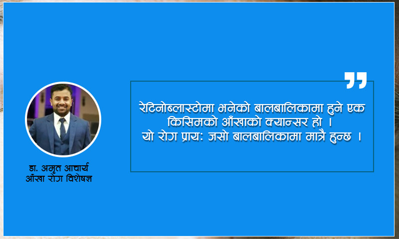 रेटिनोब्लास्टोमा भनेको बालबालिकामा हुने एक किसिमको आँखाको क्यान्सर हो । यो रोग प्रायः जसो बालबालिकामा मात्रै हुन्छ । यदि बाबुआमामा रेटिनोब्लास्टो छ भने बालबालिकामा देखिने सम्भावना उच्च हुन्छ । तर, कहिले काही बाबुआमामा यस्तो समस्या नभए पनि रेटिनोब्लास्टो देखिन सक्छ ।