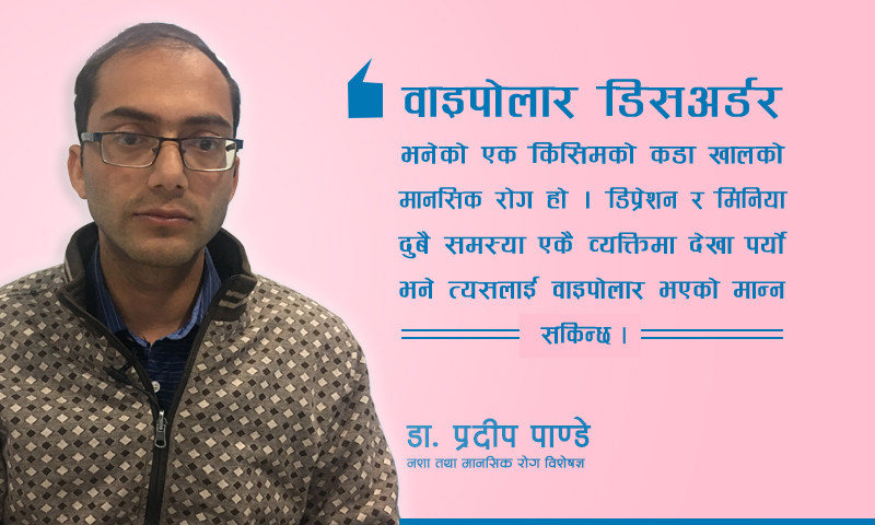 पछिल्लो समय वाइपोलार डिसअर्डरको समस्या धेरैमा देखिएको छ । यो रोगका बिरामी विश्वमा नै बढ्दै गएको विभिन्न अध्ययन अनुसन्धानले देखाएको छ । नेपालमा पनि यस्तो समस्याले धेरैलाई सताएको पाइन्छ । के हो वाइपोलर डिसअर्डर ? यो हुने कारण र बच्ने उपायबारे नशा तथा मानसिक रोग विशेषज्ञ डा. प्रदीप पाण्डेसँग गरिएको कुराकानीको सम्पादित अंश ।