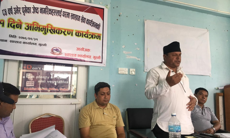 जेष्ठ नागरिकको लागि स्वास्थ्य संस्थाबाट दिईने सेवा आफ्नै घरमा स्वास्थ्यकर्र्मीद्वारा प्रदान गरिने भएको छ । यो कार्यक्रम २०७६ असार महिनाको पहिलो हप्ता भित्र जिल्लाका १२ वटै स्थानीय तह तथा प्रत्येक स्वास्थ्य संस्थामा अभिमुखिकरण कार्यक्रम गरेर असार महिनाको पहिलो हप्ताबाट नै सञ्चालनमा ल्याउने जिल्ला स्वास्थ्य कार्यालय गुल्मीले जनाएको छ ।