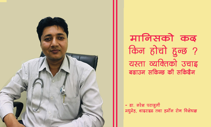 मानिसको कद किन होचो हुन्छ ? यस्ता व्यक्तिको उचाइ बढाउन सकिन्छ की सकिदैन भन्ने विषयमा मधुमेह, थाइराइड तथा हर्मोन रोग विशेषज्ञ डा. नरेश पराजुलीको भनाइ यस्तो छ ।