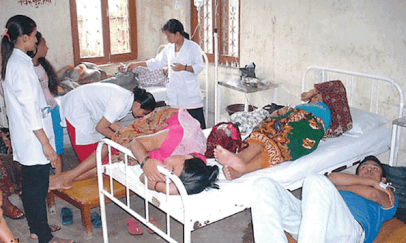 भाइरल ज्वरोका बिरामी बढ्न थालेपछि बेडको अभाव, बिरामीलाई भुइ र बेन्चमा राखेर उपचार