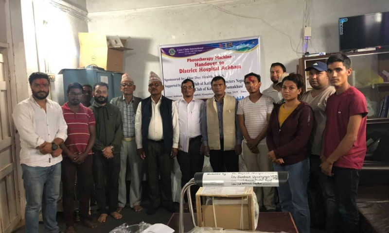 वान डे हेल्थ, युएसए नामक संस्थाले जम्मा ८ वटा फोटोथेरपी मेसिन नेपाललाई उपलब्ध गराएको थियो । मेसिन हस्तान्तरण मंगलसेनस्थित जिल्ला अस्पातलको भवन परिसरमा भएको थियो । मेसिन हस्तान्तरण कार्यक्रममा अस्पतालका मेसु मनोज बिष्ट, मंगलसेन नगरपालिकाका प्रमुख पदम बहादुर बोहोरा, प्रमुख जिल्ला अधिकृत भोजराज श्रेष्ठ, चिकित्सकद्वय डा. अतुल भारद्वाज, डा कमल साउद्, लगायतको उपस्थिति थियो ।