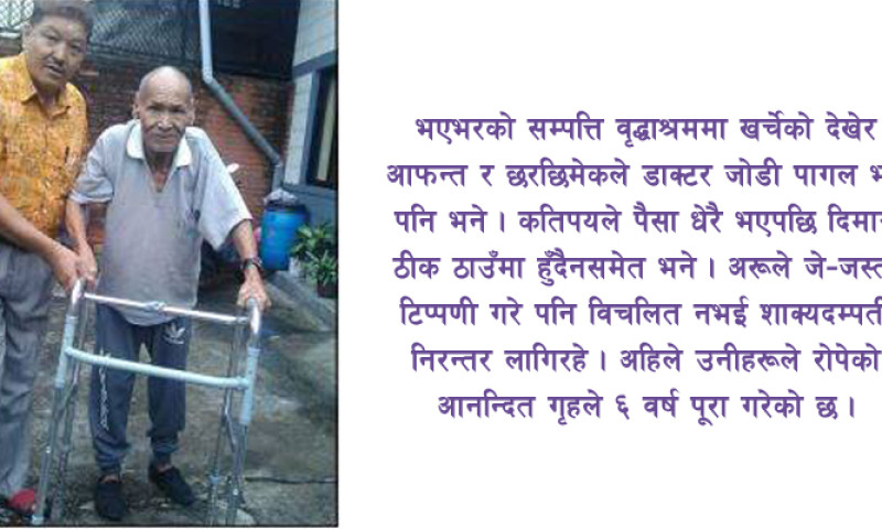 भएभरको सम्पत्ति वृद्धाश्रममा खर्चेको देखेर आफन्त र छरछिमेकले डाक्टर जोडी पागल भए पनि भने । कतिपयले पैसा धेरै भएपछि दिमाग ठीक ठाउँमा हँुदैनसमेत भने । अरूले जे–जस्ता टिप्पणी गरे पनि विचलित नभई शाक्यदम्पती निरन्तर लागिरहे । अहिले उनीहरूले रोपेको आनन्दित गृहले ६ वर्ष पूरा गरेको छ ।