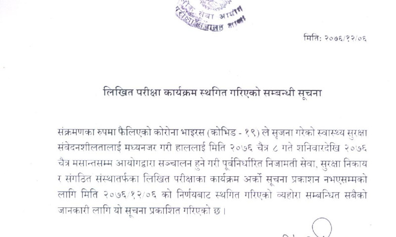 "The programmes for written examinations towards the civil service, security bodies and corporations that were prescheduled for the period of March 21 to April 12 have been put on hold for the time-being until further notice in view of the health security sensitivity emanating from COVID-19," a press release issued by Commission's under-secretary Ek Narayan Sharma states.