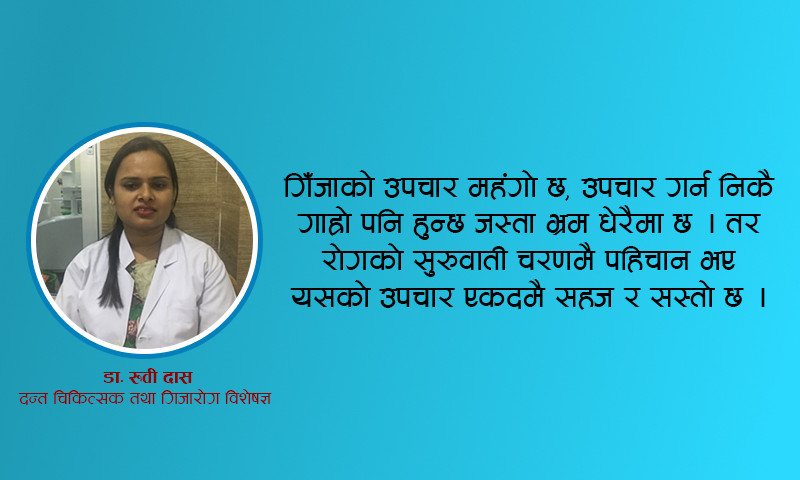 गिजा स्वास्थ्य सम्बन्धी धेरै मानिस अनभिज्ञ जस्तै छन् । ज्ञान भएकाहरू पनि त्यति सचेत भएको पाइदैन् । अझ कतिपयमा गिजा र दाँतको रोग एकै हो भन्ने गलत बुझाई छ । जसले गिजाको रोग क्रोनिक अवस्थामा पुगेर अन्य अंगमा गम्भीर असर पार्न थालेपछि मात्रै उनीहरू उपचारको लागि अस्पताल पुग्नेगर्छन । गिजामा कस्ता कस्ता रोग लाग्छ र यसबाट कसरी बच्ने भन्ने विषयमा दन्त चिकित्सक तथा गिँजारोग विशेषज्ञ डा. रुवी दासको सुझाव यस्तो छ :—