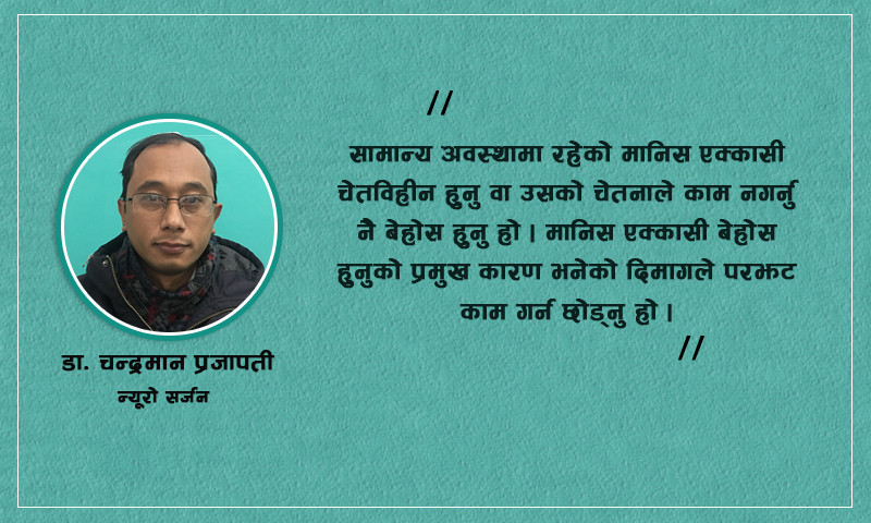 एक्कासी बेहोस भएको, हिँड्दाहिँड्दैको मानिस ढलेको वा मुर्छा परेका घटना हामी दैनिकजसो सुन्र्छौ । कति मानिसको त बेहोस अवस्थामै ज्यान गुमाएको समेत सुन्ने गरेका छौं । स्वास्थ्यमा के समस्या भए मानिस यसरी एक्कासी मानिस बेहोस हुन्छ ? यसबाट कसरी बच्ने भन्ने विषयमा न्यूरो सर्जन डा. चन्द्रमान प्रजापतीको भनाइ यस्तो छ :–